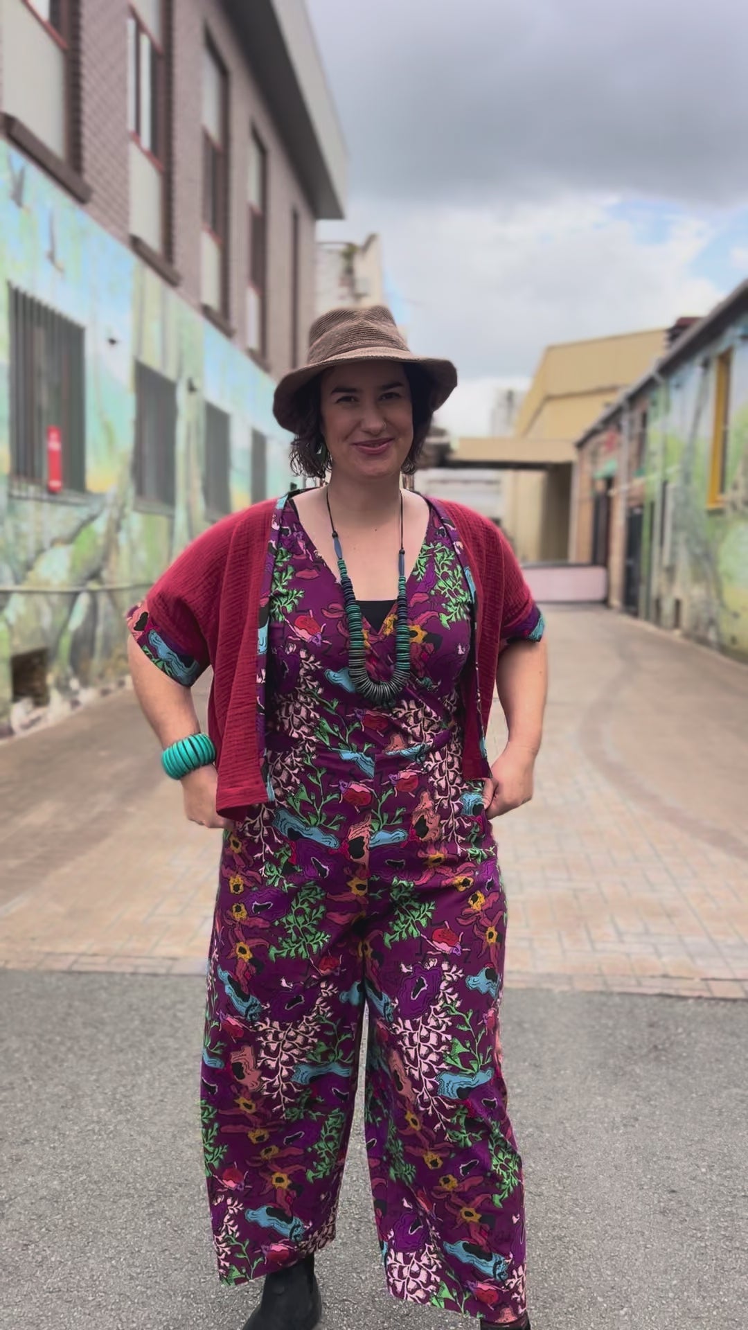 Deep rust with cotton sateen Little Darlings trim featuring a bright and quirky trumpet mushroom design - matching perfectly with the Little Darlings Storyline jumpsuit