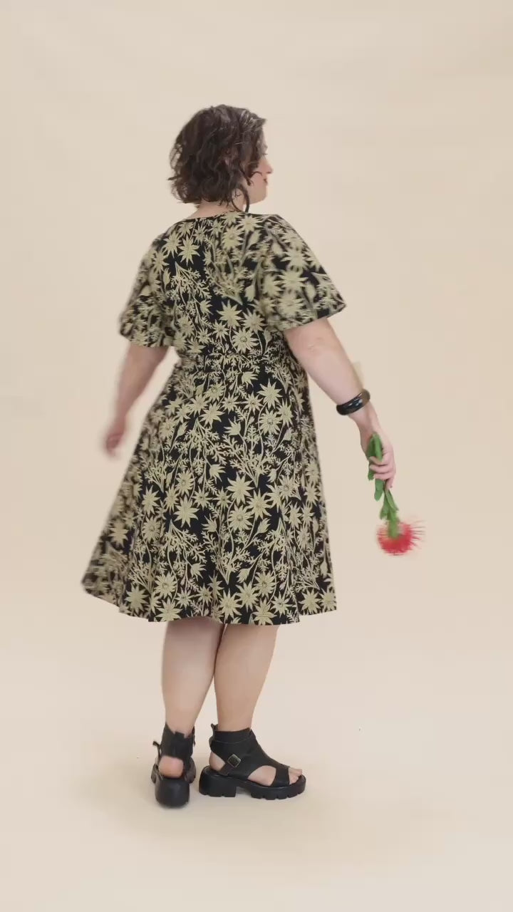 Summer-ready wrap dress with flutter sleeves and a comfy, flexible fit