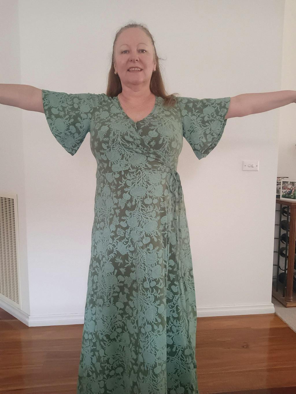 Queenly, maxi wrap dress with flexible comfortable sizing